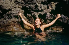 According to Lipa, the title Radical Optimism was inspired by "the idea of going through chaos gracefully and feeling like you can weather any storm".[10] The artwork of the album was unveiled along with its announcement. Shot by Tyrone Lebon,[11] it depicts the singer floating in an ocean and the silhouette of a nearby shark seemingly approaching her.[12]