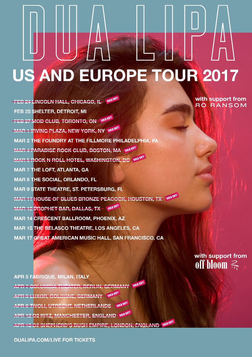 During January 2017, Dua started to tease an exciting announcement on social media and on January 17 she revealed the North American tour with 15 confirmed dates. Tickets for all North American dates went on sale on January 21st. On January 20, 2017, Dua announced a small batch of European dates as part of the 2017 concert tour. Tickets for European dates went on sale on February 3rd.